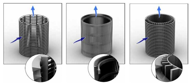 Cylindrical screens function by utilizing the wire gaps formed between the V-shaped profiles. While smaller particles can flow through these gaps, larger residues are effectively blocked, preventing them from passing through.